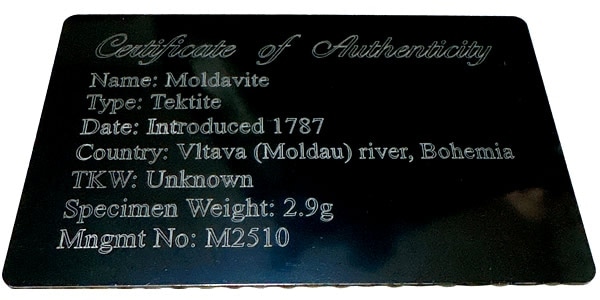 真正性保証書はこの隕石は間違いなく本物の隕石だと当店が保証いたしますというものです。カードサイズで隕石の情報と重さや管理番号が記載されます。