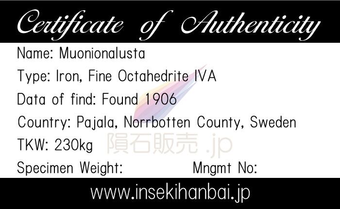 紀元前約100万年に現在のスウェーデンとフィンランドの国境の西にあるスカンジナビア北部に落下したとされています。総質量は230kgの鉄隕石で1910年にHogbom教授がムオニオ川沿いのMuonionalustaという地名にちなんでムオニオナルスタと名づけました。研究によれば地球上に落下して以来、4回の氷河期を経験しており北極のツンドラにある氷山や氷堆石からも発掘されています。鉄隕石の中でもウィドマンシュテッテン構造が美しく出る隕石として人気がありますが飛散地域が北極圏にあるためにメテオライトハンターでも探知が困難で市場に流通している量も多くはない隕石です。