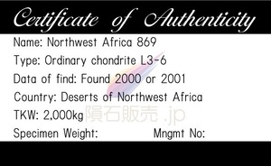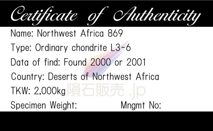 正式な隕石名はNorthwest Africa 869です。確認されている総質量は約2tとされていますが記録されていない総数も合わせると7t近くあったのではないかと言われており、発見された正確な緯度経度は秘匿されていますがアフリカ北西部の隕石採集者によってサハラ砂漠にて発見されました。2019年6月時点では発見されている石質隕石の中で最も大きな普通コンドライトであり、何千にもなる破片が採取され、1g程度の小さなものから20kg近い大きなものまでありNWA869という名前で世界中で販売されています。