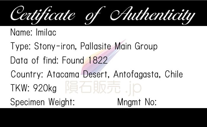 総質量は920kgとされており1822年にチリ北部のアタカマ砂漠で発見されました。kg単位の塊が多くのメテオライトハンターに発見され数g単位の小さな破片も数多く発見されており、イミラック隕石の標本はオリビンのきめが細かく美しいことから隕石コレクターから高く評価されています。近年ではメテオライトハンターが大型の機械を導入し落下地域の捜索を成功させましたが、世界中のコレクターに人気があるため取引価格が上昇しています。