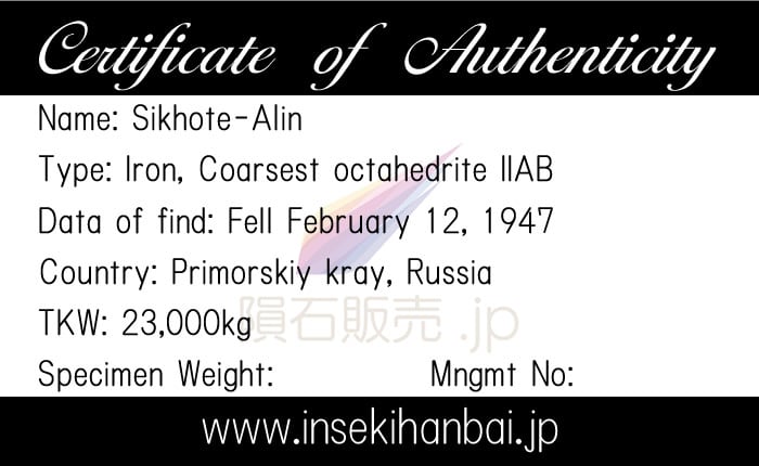 1947年2月12日に東シベリアの人々が巨大な単一隕石の落下を目撃しました。ものすごい爆音が轟き、その光と爆発音は半径300kmにわたって観測されました。この火球の正体は小惑星で70トンを超える隕石が地球に突入した際にいくつかの破片となって落下し、最大のクレーターは直径26m、深さ6mもの大きさだったそうです。完全な塊での隕石はレグマグリプトという指でおしたようなへこみが見られます。また鉄隕石のIIABはウィドマンシュテッテン構造のバンド幅が非常に広く、エッチングをするとウィドマンシュッテテン構造が確認できる標本やヘキサへドライトのノイマンラインが確認できる標本があります。
