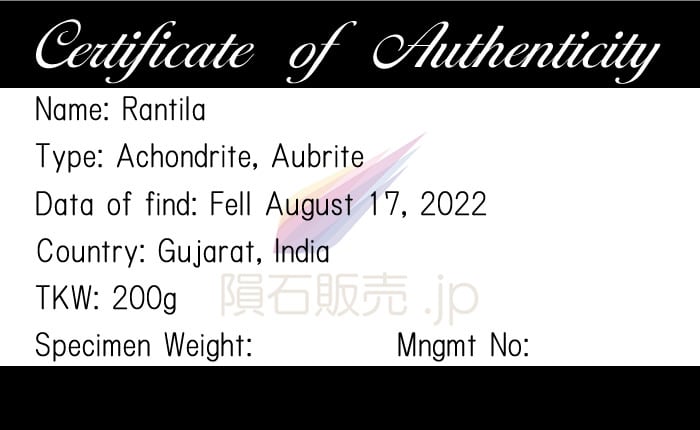 2022年8月17日にインド共和国グジャラート州ランティラ村とラヴェル村という約10.5km離れた近隣の2つの村で隕石の落下が観測されました。隕石はランティラ村の軟弱な粘土質の農地に落下しましたが落下中に木の枝に衝突して砕けました。複数の隕石の破片が畑に散らばっているのが発見され、大きな破片は軟弱で湿った土壌に衝突したため、直径約28cm、深さ約15cmの穴が開いていました。落下後わずか数分で塊は回収され、総回収量は200gほどとなっています。