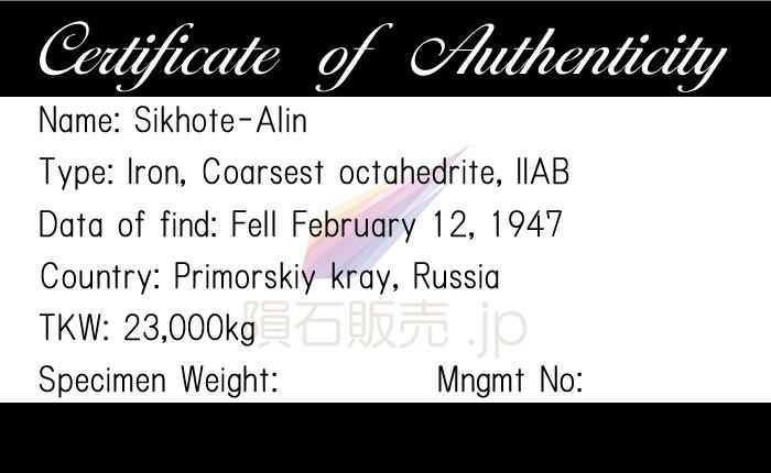 1947年2月12日に東シベリアの人々が巨大な単一隕石の落下を目撃しました。ものすごい爆音が轟き、その光と爆発音は半径300kmにわたって観測されました。この火球の正体は小惑星で70トンを超える隕石が地球に突入した際にいくつかの破片となって落下し、最大のクレーターは直径26m、深さ6mもの大きさだったそうです。完全な塊での隕石はレグマグリプトという指でおしたようなへこみが見られます。また鉄隕石のIIABはウィドマンシュテッテン構造のバンド幅が非常に広く、エッチングをするとウィドマンシュッテテン構造が確認できる標本やノイマンラインが顕著に現れる標本もあります。