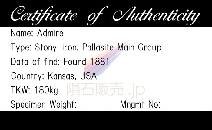 当初の総質量は約180kgでしたが発見された総質量は1トンを超えており、多くの破片が発見されています。2010年代にアメリカで放映された隕石ハンターが主演の「MeteoriteMen」というドキュメンタリー番組で100kgを超える隕石が発見され話題となりました。ニューメキシコ大学で29kg、米国国立博物館で15kgが保管されています。カッティングした直後のものは非常に素晴らしいパラサイトなのですが不安定で防錆処理をしていないと非常に錆びやすい傾向にあります。