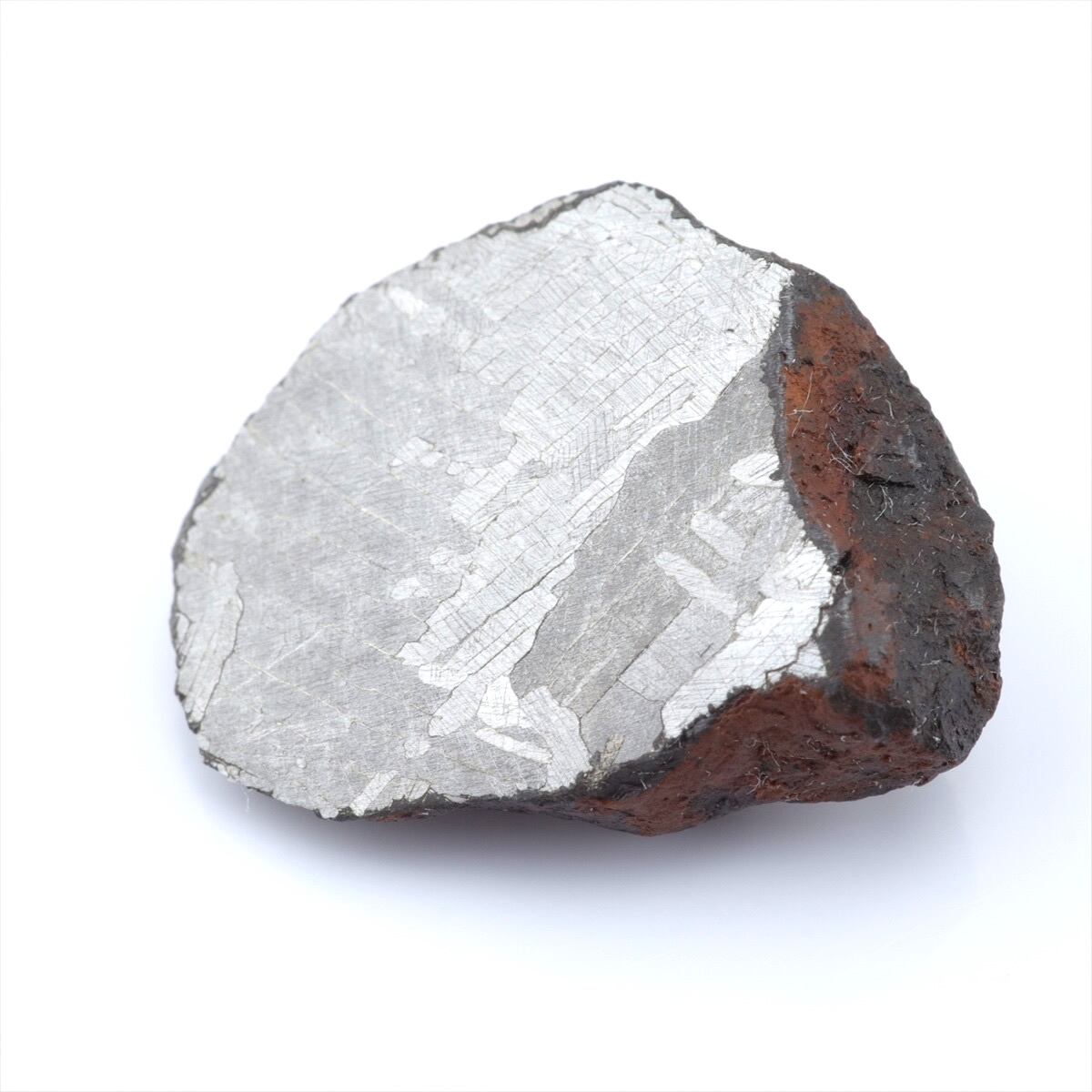 オクタヘドライトという名前はテーナイトの結晶格子の角にカマサイトが成長し八面体(オクタへドロン)構造になることに由来しており、酸処理を施すとカマサイトよりも酸に溶けにくいテーナイトが浮かび上がり特徴的な模様のウィドマンシュテッテン構造が現れます。ウィドマンシュテッテンとは構造を一番初めに論文として発表したカウント・アロイス・フォン・ウィドマンシュテッテン氏からきています。