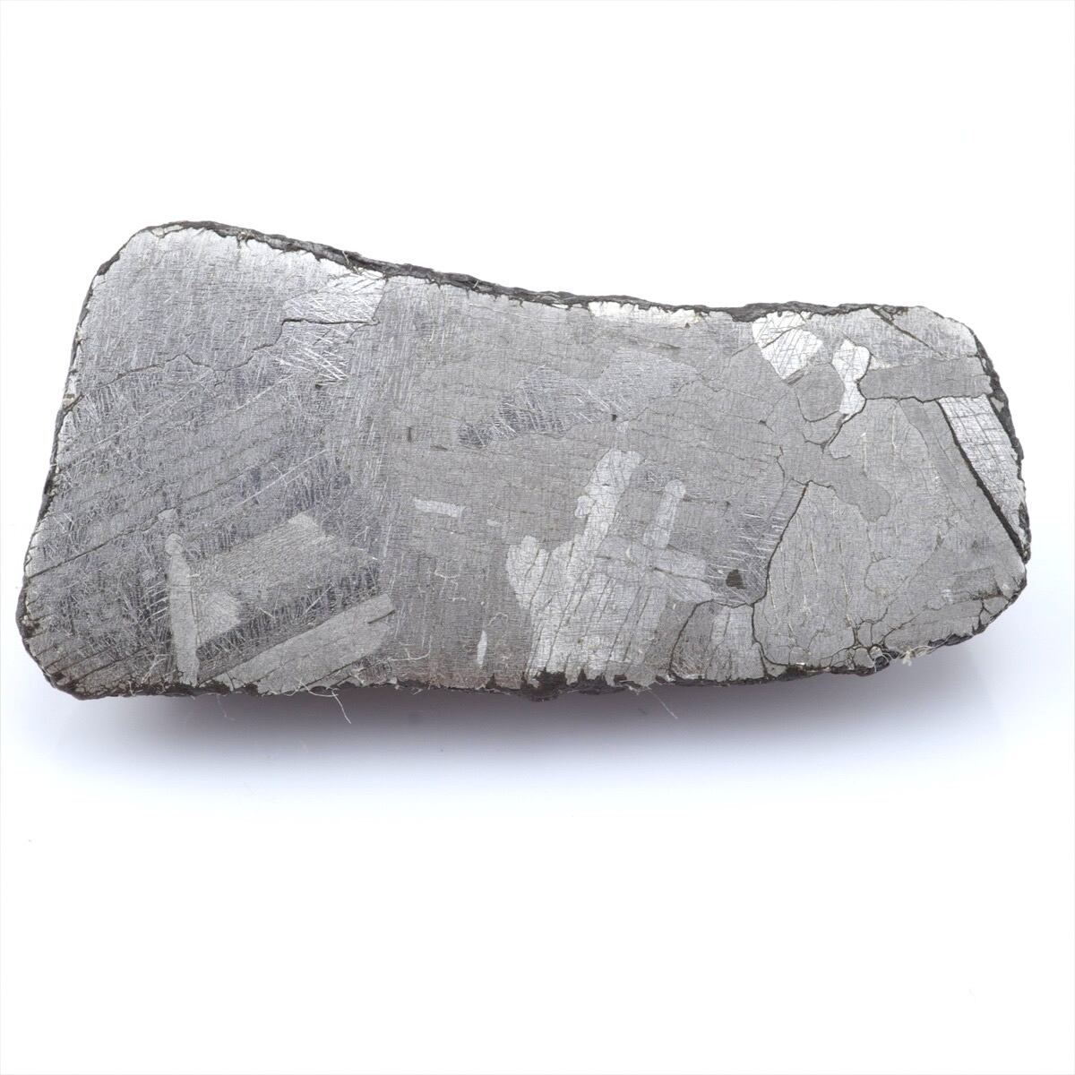 オクタヘドライトという名前はテーナイトの結晶格子の角にカマサイトが成長し八面体(オクタへドロン)構造になることに由来しており、酸処理を施すとカマサイトよりも酸に溶けにくいテーナイトが浮かび上がり特徴的な模様のウィドマンシュテッテン構造が現れます。ウィドマンシュテッテンとは構造を一番初めに論文として発表したカウント・アロイス・フォン・ウィドマンシュテッテン氏からきています。