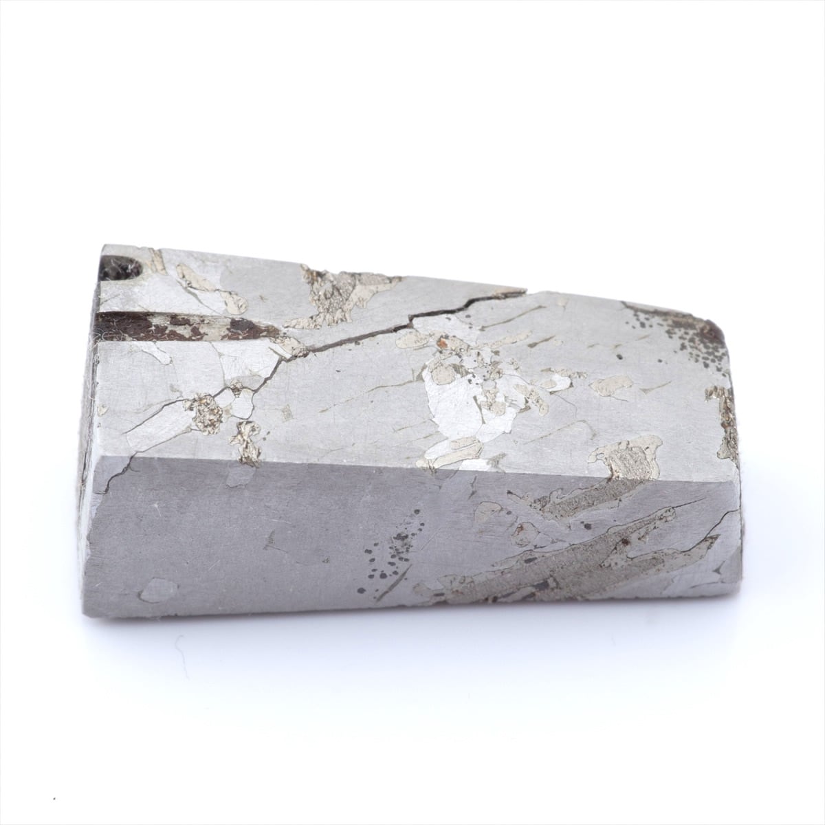 オクタヘドライトという名前はテーナイトの結晶格子の角にカマサイトが成長し八面体(オクタへドロン)構造になることに由来しており、酸処理を施すとカマサイトよりも酸に溶けにくいテーナイトが浮かび上がり特徴的な模様のウィドマンシュテッテン構造が現れます。ウィドマンシュテッテンとは構造を一番初めに論文として発表したカウント・アロイス・フォン・ウィドマンシュテッテン氏からきています。