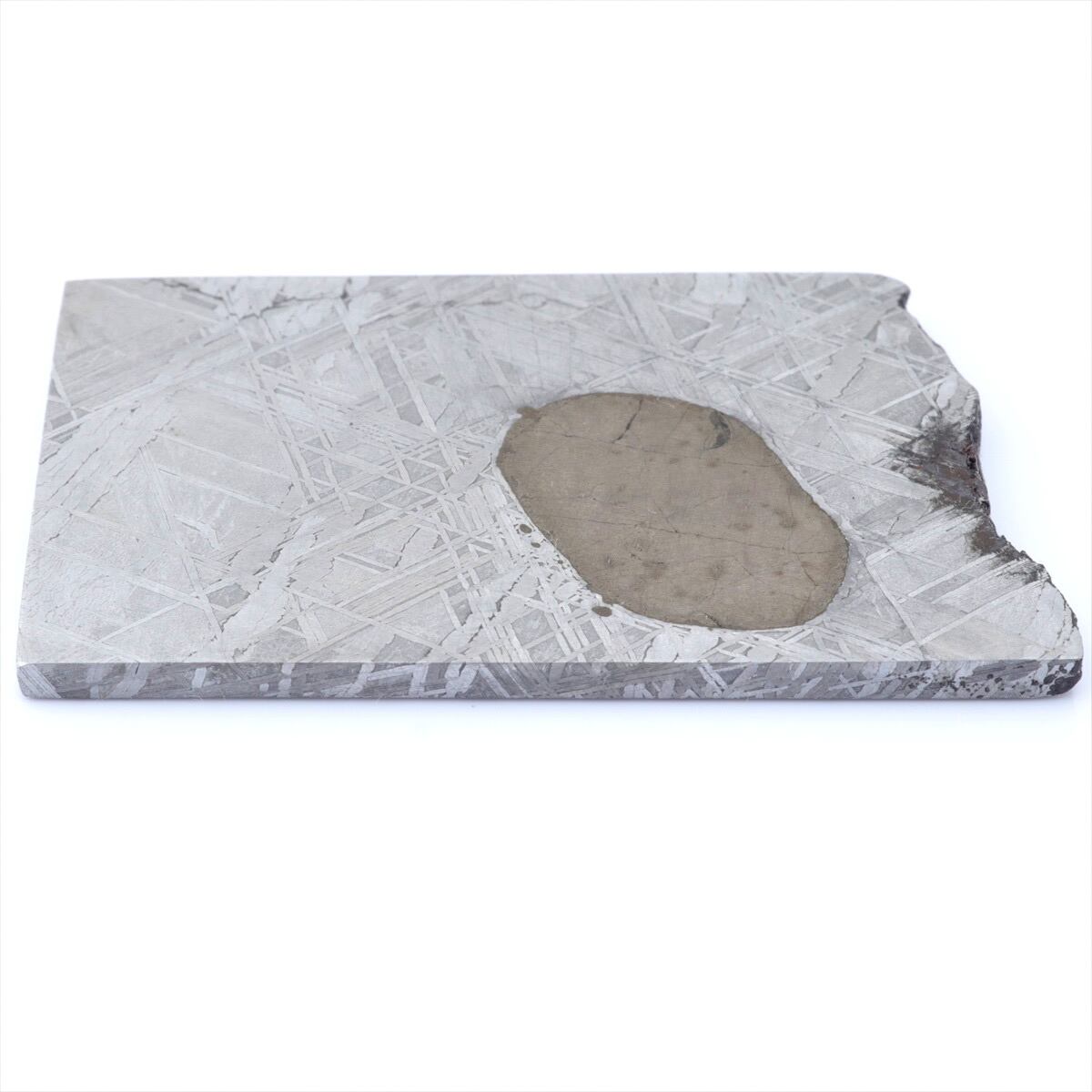 オクタヘドライトという名前はテーナイトの結晶格子の角にカマサイトが成長し八面体(オクタへドロン)構造になることに由来しており、酸処理を施すとカマサイトよりも酸に溶けにくいテーナイトが浮かび上がり特徴的な模様のウィドマンシュテッテン構造が現れます。ウィドマンシュテッテンとは構造を一番初めに論文として発表したカウント・アロイス・フォン・ウィドマンシュテッテン氏からきています。