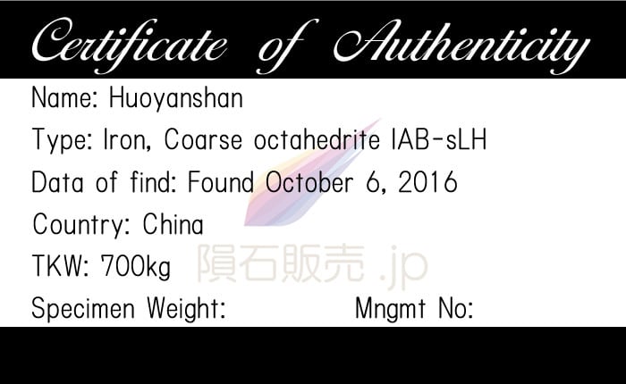 発見場所の近くの油田で働いているYanzheng Wang氏とJifa Li氏によって発見されました。翌日には2x1.5平方キロメートルの範囲で18個の破片が回収され、各々が100g〜8.9kgほどありましたが隕石を発見したというニュースは瞬く間に広がったため多くの人々が金属探知機をもって隕石を探し、総質量は700kgで数千個が収集されたと推定されています。中国科学院地質与地球物理研究所が1kg、Wang氏、Li氏およびその他3人で最大400 kgを保有しており、その他で最大300kgが所有されています。IABグループについてはsLH(Low-Au、High-Ni)など複数のグループに分割されています。