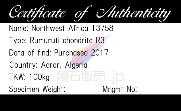 正式な隕石名はNorthwest Africa 13758です。サハラ砂漠の隕石ディーラーがアルジェリアの遊牧民から購入し、その後にMark Lyon氏とDustin Dickens氏が入手したことで登録されました。最初の塊が発見されたのはタネズロフト高原で最も近い町はアルジェリアのアドラルにあるレゲインだと伝えられています。既知の総重量は約100kgで質量1gから5kg超までの約500個が発見されており、1127gの完全な塊と57gのスライスがアメリカ合衆国ニューメキシコ大学に寄託され、Mark Lyon氏は20kgの主要な塊を所有し、Dustin Dickens氏は60kgの中・小型の塊を所有しています。