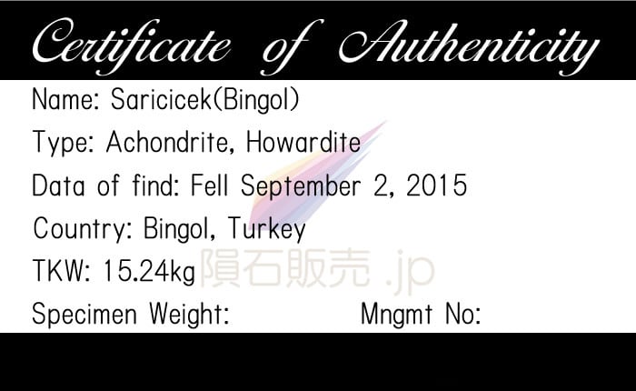 2015年9月2日20時10分頃トルコのビンギョル県で明るい火球が目撃された後にソニックブームが発生したと複数の防犯カメラに記録されていました。サリチチェク村には小さな隕石が降り注ぎ翌朝には路上や庭でエンドウ豆くらいの石を人々が発見しました。ビンギョル大学の教授や学生達が熱心な捜索を行い総回収量は15.24kgあります。この隕石はSaricicekとBingolの両方の呼び名があり公式名はSaricicekです。