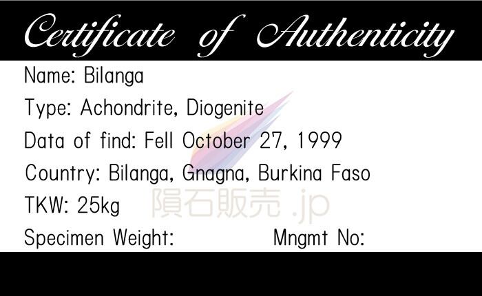総既知重量25kgで最もひどく分裂したダイオジェナイトの1つです。現地時間10時30分に隕石のシャワーが広く目撃された後、ビランガ村周辺に落下したと報告されています。地元の村人たちはいくつかの大きな爆発を聞きましたが、その日は空が雲で覆い隠されていたので何も見えず、しばらくしてから村を囲む広い範囲にたくさんの石が落ちるのを発見し、新鮮な黒い核融合地殻を持つ25kgの隕石が集められました。Michael Farmer氏は2000年にブルキナファソへ渡航し落下現場から多くの標本を回収しました。2019年現在では新しい標本が見つかっておらず、今現在流通しているもの以外ではビランガ隕石は入手することができません。将来的にコレクターが欲しがることは決定的ですが入手することは難しいとMichael Farmer氏は話していました。