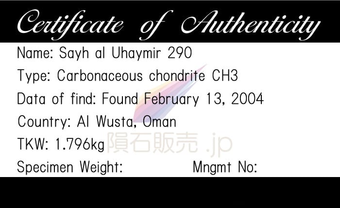 正式な隕石名はSayh al Uhaymir 290です。Rainer Bartoschewitz夫妻がウスタ行政区で自然科学調査を行っていたところ半径約5mに散らばった多数の破片を発見し、破片は全部で64個あり、それぞれ0.2-888gほどの重さで総重量は1796gでした。約20gが東京大学地震研究所に寄託されており岡山大学や九州大学の箱崎サテライトもこの隕石を所有し、ドイツのバルトシュビッツ隕石研究所には合計1500gが保管されています。この隕石のほとんどが様々なテクスチャーの小さなコンドリュールと細粒金属と少しの小さなマトリックス塊と稀な耐火性包有物から構成されています。