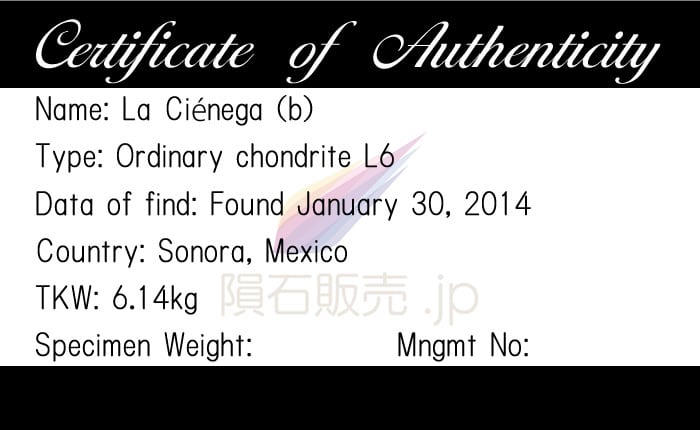 HugoLino氏がメキシコのソノラにあるラシエネガの廃坑の近くで金の探査を行っていたところ6143gの隕石を発見しました。その後にM.Farmer氏に売却され、164gの標本が分析のためにアリゾナ州立大学に送られたことで隕石として登録されました。
