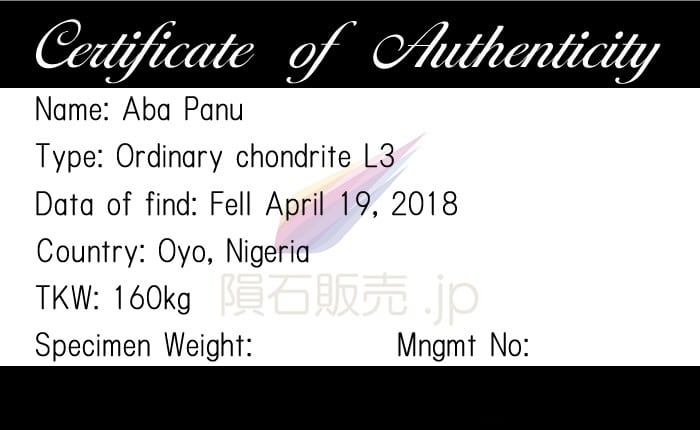 総既知重量160kgで、2018年4月19日の午後14時02分に複数の大きな火の玉がナイジェリアのオヨ州に落下しました。多くの隕石がイパポの村とテデの北側に落ちたため、隕石は複数の場所で集められました。隕石は落下点の中央近くにあるアバパヌの村にちなんで名付けられ、この村の中と周辺には複数のkg単位の隕石が見つかっています。Michael Farmer氏およびMoritz Karl氏が50kg、Eric Twelker氏が7.74kg、ASUが242g、その他はナイジェリア政府によって100kgほどが収集されたと推定されています。