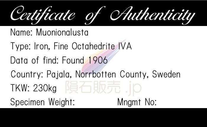 紀元前約100万年に現在のスウェーデンとフィンランドの国境の西にあるスカンジナビア北部に落下したとされています。総質量は230kgの鉄隕石で1910年にHogbom教授がムオニオ川沿いのMuonionalustaという地名にちなんでムオニオナルスタと名づけました。研究によれば地球上に落下して以来、4回の氷河期を経験しており北極のツンドラにある氷山や氷堆石からも発掘されています。鉄隕石の中でもウィドマンシュテッテン構造が美しく出る隕石として人気がありますが飛散地域が北極圏にあるためにメテオライトハンターでも探知が困難で市場に流通している量も多くはない隕石です。
