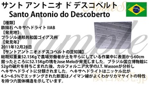 ブラジル国立博物館に52gの破片を持ちこまれた後、カルフォルニア大学のJ.T. Wasson氏が分析しヘキサヘドライトに分類されました。