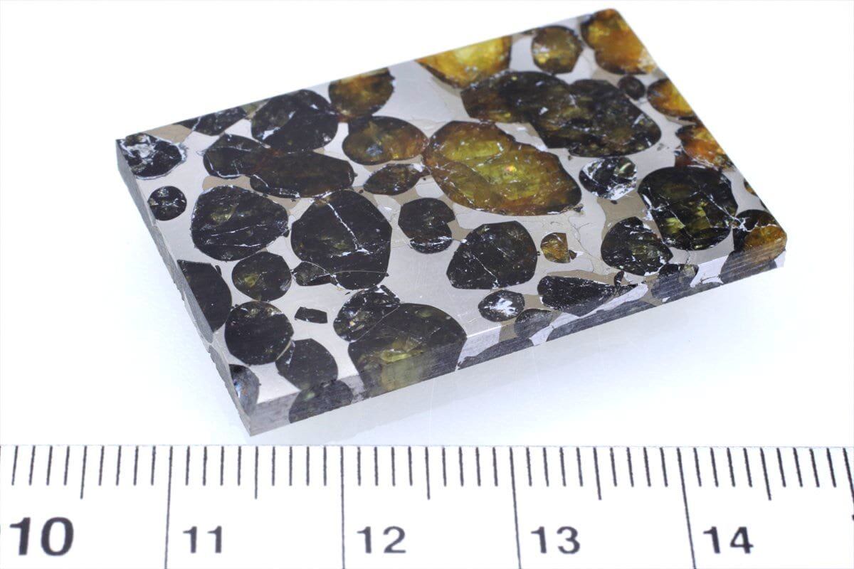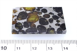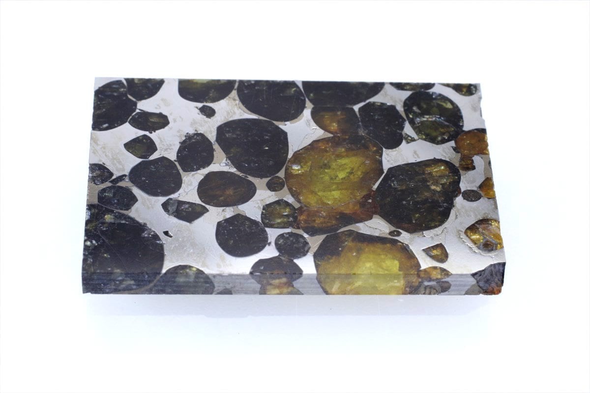 丸みのある粗粒状のカンラン石とその間を埋める鉄-ニッケル合金から出来ておりパラサイトという名前はシベリアの山中にあるクラスノヤルスク付近で発見された隕石を研究したドイツの博物学者ペーター・ジーモン・パラス氏にちなんで1772年に名付けられました。パラサイトの鉄-ニッケル部分はオクタへドライトなのでエッチングによりウィドマンシュテッテン構造が現れトロイライトやシュライバーサイトが含まれていることが多くあります。