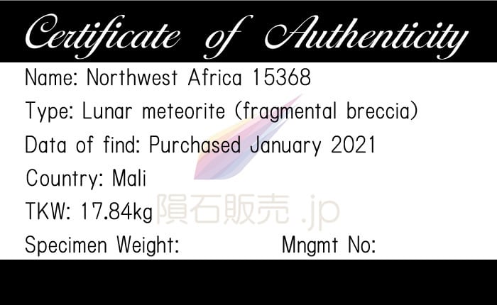 正式な隕石名はNorthwest Africa 15368です。2021年1月にマリ共和国でラクダと羊を飼っている者により総質量17.84 kgの塊が発見され、その後にAhmed Salek氏が購入し米国の匿名コレクターに販売されました。2022年12月現在、米国の匿名コレクターが主塊を保有しており、NWA15368は別名アルテミス17と呼ばれています。黒っぽい外観で部分的にカリーチに覆われており切断面からはガラス質の暗灰色の中に断片的な角礫岩が見えます。