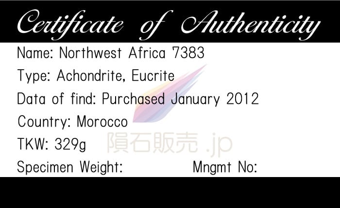 正式な隕石名はNorthwest Africa 7383です。サハラ砂漠で総質量329gの塊を発見したモロッコの隕石ハンターがアメリカで開催されているツーソンショーに持ち込み、Michael Farmer氏が購入したことで登録されました。塊の外観はやや風化していますが切断すると新鮮な薄灰色で細粒の層が出現します。ニューメキシコ大学のC. Agee氏が分析し20gのスライスが大学に寄託されており、Michael Farmer氏が主塊を保有しています。