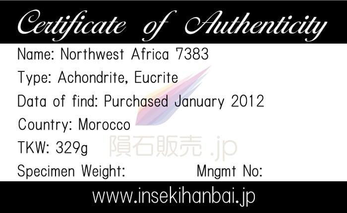 正式な隕石名はNorthwest Africa 7383です。サハラ砂漠で総質量329gの塊を発見したモロッコの隕石ハンターがアメリカで開催されているツーソンショーに持ち込み、Michael Farmer氏が購入したことで登録されました。塊の外観はやや風化していますが切断すると新鮮な薄灰色で細粒の層が出現します。ニューメキシコ大学のC. Agee氏が分析し20gのスライスが大学に寄託されており、Michael Farmer氏が主塊を保有しています。
