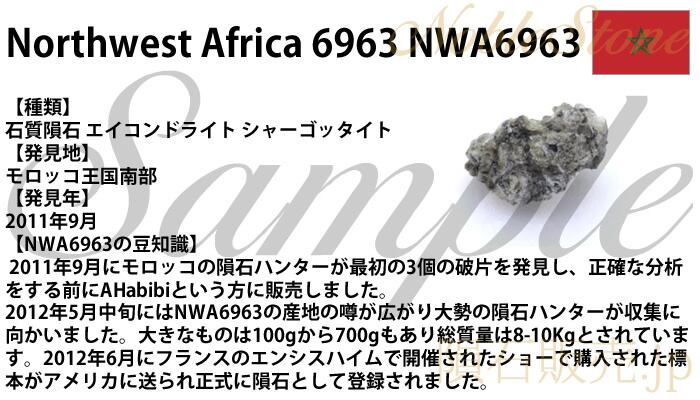 正式な隕石名はNorthwest Africa 6963です。2011年9月にモロッコの隕石ハンターが最初の3個の破片を発見し正確な分析をする前にAHabibi氏に販売しました。その後、この隕石ハンターは約6か月間、同じ場所で破片の収集をし続け、2012年5月中旬にはNWA6963の産地の噂が広がり大勢の隕石ハンターが収集に向かいました。大きなものは100gから700gもあり総質量は8-10kgとされています。2012年6月にフランスのエンシスハイムで開催されたショーで購入された標本がアメリカに送られ正式に隕石として登録されました。NWA6963の別名は採取された場所にちなんでフェイエルリーとも言います。
