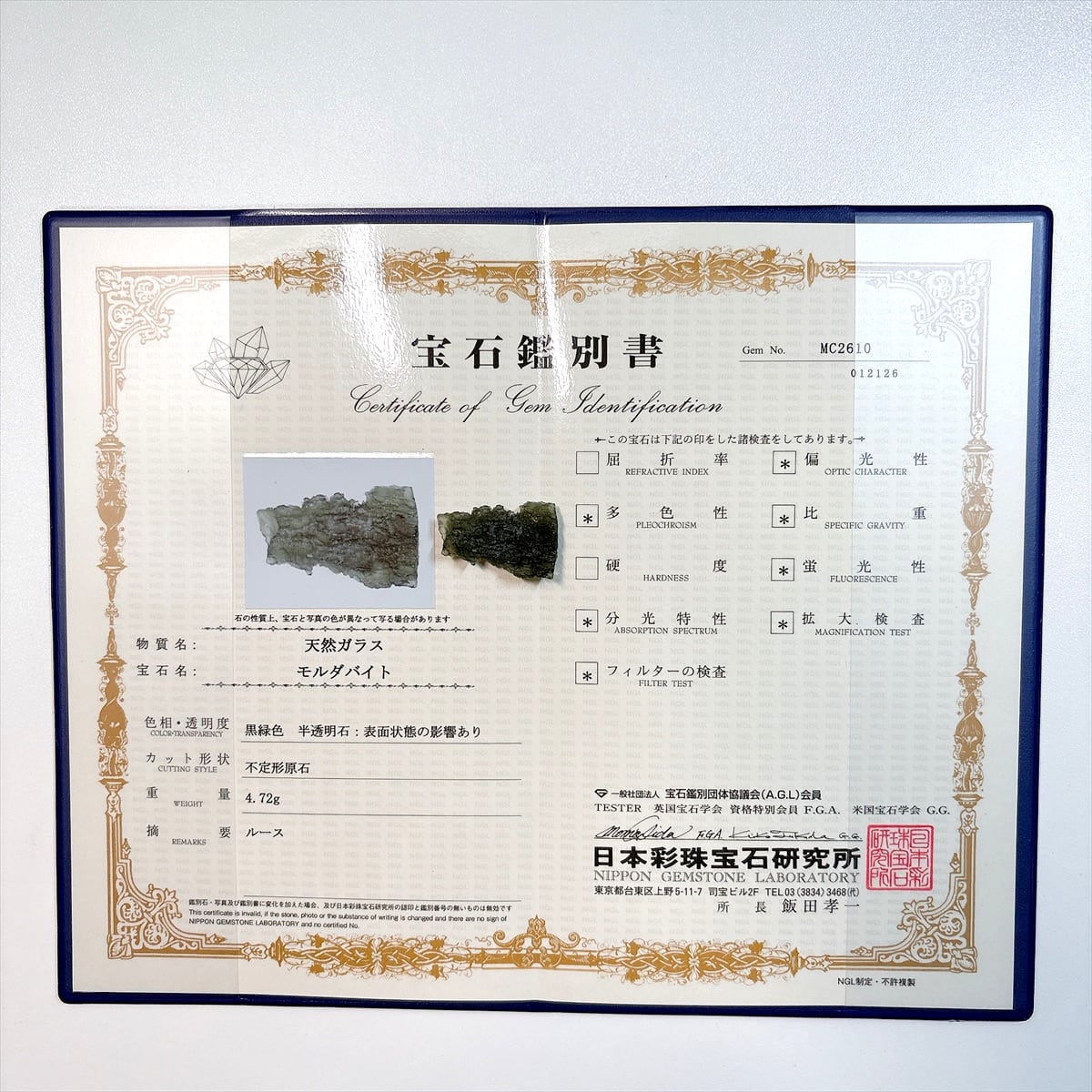 モルダバイト 4.7g 鑑別書付き モルダウ石 テクタイト 原石 標本 Moldavite M2528