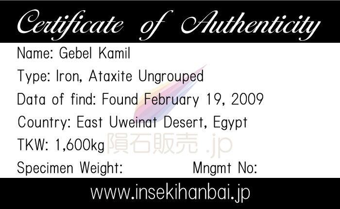 総質量は約1.6トンとされており、約5000年前にエジプト・アラブ共和国の東ウェイナット砂漠に落下し、2009年に初めて発見されました。発見された経緯としてはエジプトは2007年から10年の間、科学技術を発展させるために様々な国と協力体制をとっており、2009年2月と2010年2月にイタリアとエジプトの地球物理学チームが物理学的調査の一環でカミルクレーターを調査していると、クレーターから半径45メートルの範囲で質量1g未満のものから35kgまでの破片の合計1.6トンと発達したレグマグリプトで完全に覆われた83kgの標本を発見しました。