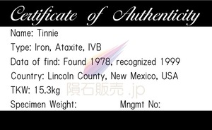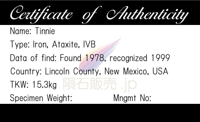 1978年にニューメキシコ州ティニーでバーバリーシープの研究をしていた大学院生が丘の中腹で15.3kgの鉄隕石を発見しました。その後にアメリカにあるカリフォルニア大学のJ.Wasson氏が分析したことで1999年に正式に隕石として認められ登録されました。カリフォルニア大学には53gの標本が収蔵されています。世界中のマーケットを見ても現代では売りに出されていない超希少なプレッサイト質のアタキサイトです。