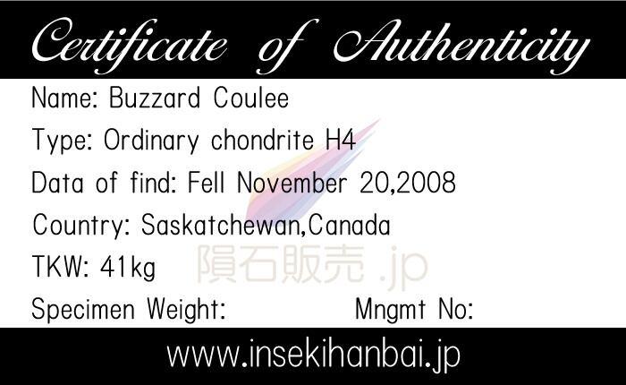 2008年11月20日の17時半頃にアルバータ州、サスカチュワン州、マニトバ州で明るい火球が広く観測されました。目撃者のインタビューと監視カメラなどによって落下地域が限定され、11月27日深夜にカルガリー大学修士課程の学生が研究していた養魚池から一つ目の隕石を発見、12月6日に積雪が増加し捜索が困難になるまでに合計129個、約41 kgの破片が回収されました。ローンロック、バトルリバー、マースデンなどが隕石の名前の候補に挙がっていましたがカルガリー大学の研究者たちは地元住民に倣って落下地点で最も古い名前にちなんでBuzzardCouleeと正式に命名しました。