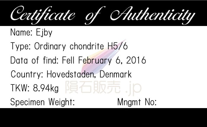 2016年2月6日22時10分頃にデンマーク東部上空で明るい火球が観測されました。その翌日には60gある破片がコペンハーゲン西部にあるEjbyの民家前で発見されました。同日中に6.5キロの粉々になった破片が、とある会社のタイル張りの中庭で見つかりました。その後19日間で5×5kmの範囲で合計11個の隕石が発見され、総回収量は8.94kgで最大のものは6.5kgありましたがタイル張りの場所に衝突したため数百の破片に砕け散りました。回収された破片のほとんどをデンマーク自然史博物館が所蔵しています。