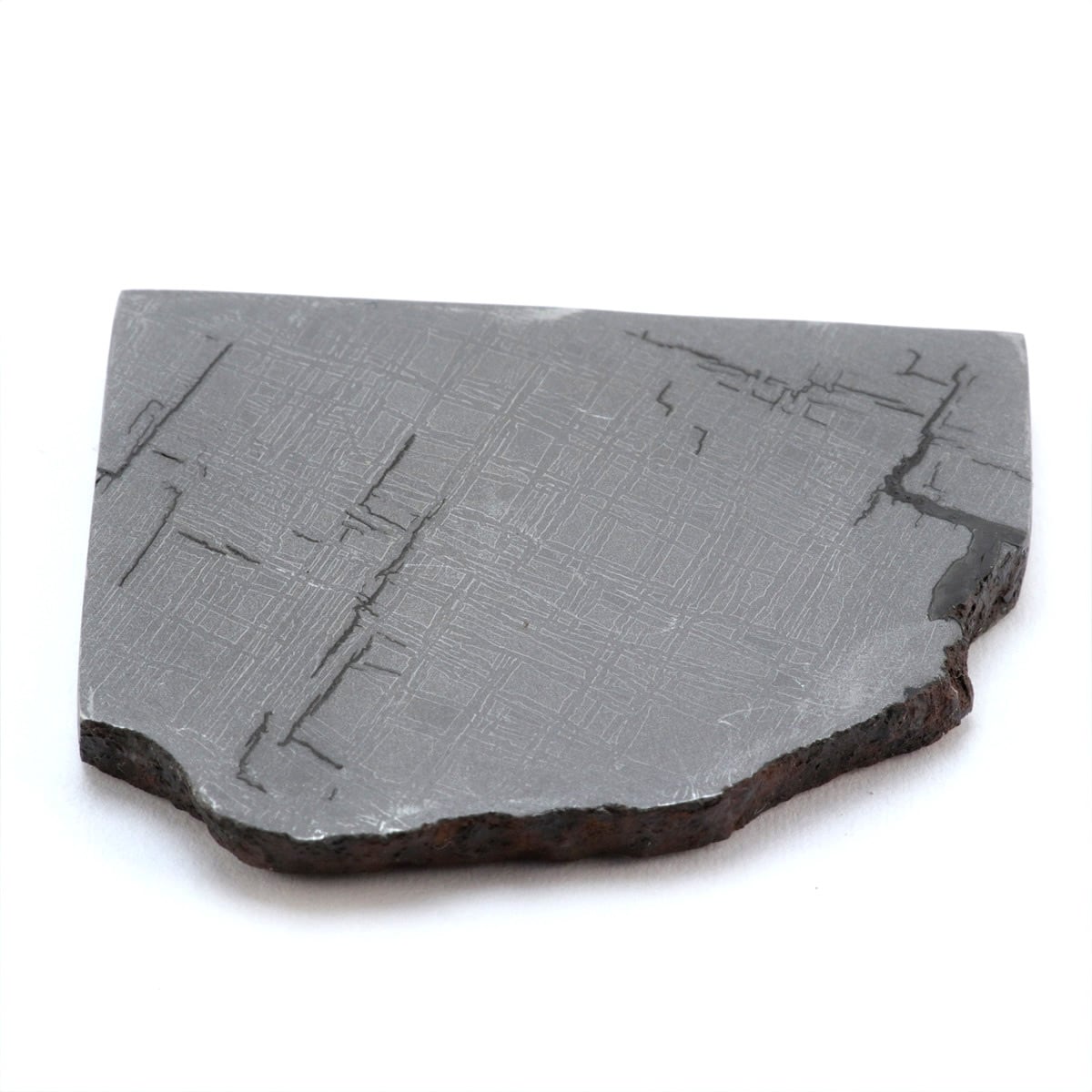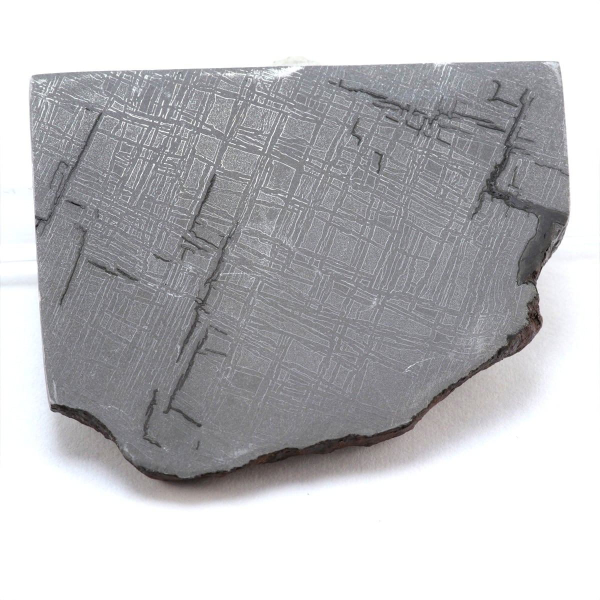 オクタヘドライトという名前はテーナイトの結晶格子の角にカマサイトが成長し八面体(オクタへドロン)構造になることに由来しており、酸処理を施すとカマサイトよりも酸に溶けにくいテーナイトが浮かび上がり特徴的な模様のウィドマンシュテッテン構造が現れます。ウィドマンシュテッテンとは構造を一番初めに論文として発表したカウント・アロイス・フォン・ウィドマンシュテッテン氏からきています。
